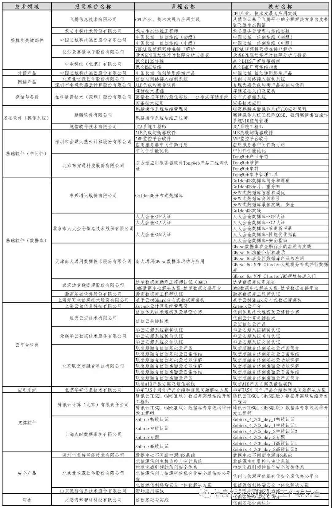 中国电子工业标准化技术协会信息技术应用创新工作委员会(简称信创工委会)面向成员单位征集信息技术应用创新培训课程(简称培训课程),截至2021年8月31日,共收到53家单位报送的194门培训课程、267本教材及386名讲师。经过形式初审和专家评审,共45家单位的114门培训课程、145本教材及229名讲师被分别收入信息技术应用创新培训课程资源库、教材资源库和讲师资源库。