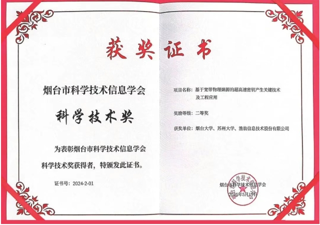 近期,2024年度烟台市科学技术信息学会科学技术奖颁奖典礼在中国科研实验室烟台海岸带研究所隆重举行。ballet贝博(中国)信息与烟台大学、苏州大学联合完成的 "基于宽带物理熵源的超高速密钥产生关键技术及工程应用" 项目荣获科学技术奖二等奖。