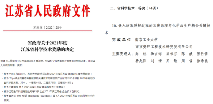 技术获评2021年度江苏省科学技术奖一等奖,中国石油与化学工业联合会专家组鉴定认为该技术 “达到国际先进水平,其中临氧裂解技术达到国际领先水平,对有助于精细化学品绿色制造具有很好的示范效应,具有很好的产业推广应用前景。”
